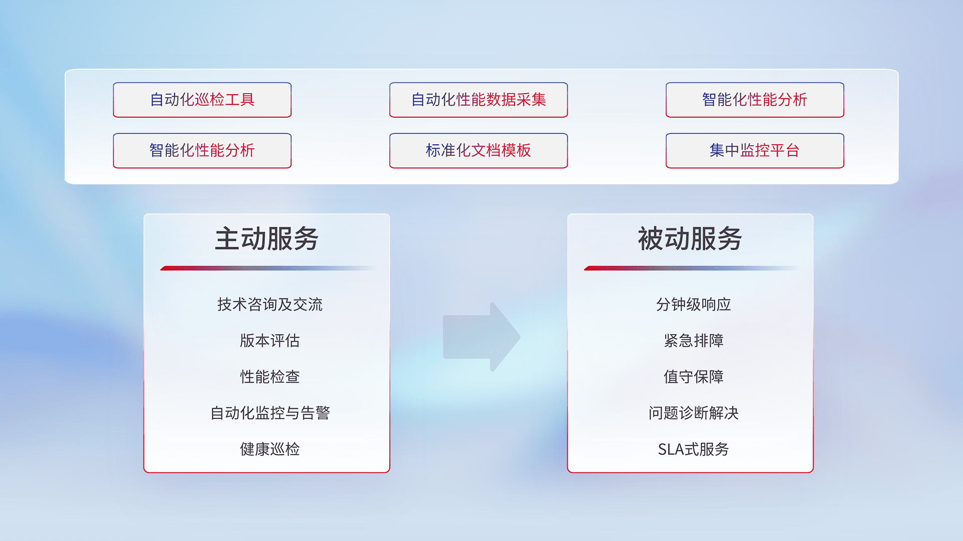 智能化工具和标准化文档,,保障服务质量,,提供主动服务(包含技术咨询、、、、版本评估、、、性能检查、、自动化监控与告警、、健康巡检)和被动服务包含(分钟级响应、、紧急排障、、、、值守保障、、、、问题诊断解决、、SLA服务)。。